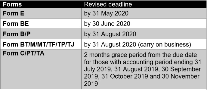 IRB announced that the last day to file the various income tax return forms for year 2019 has been extended by two months from the original deadline as follows: